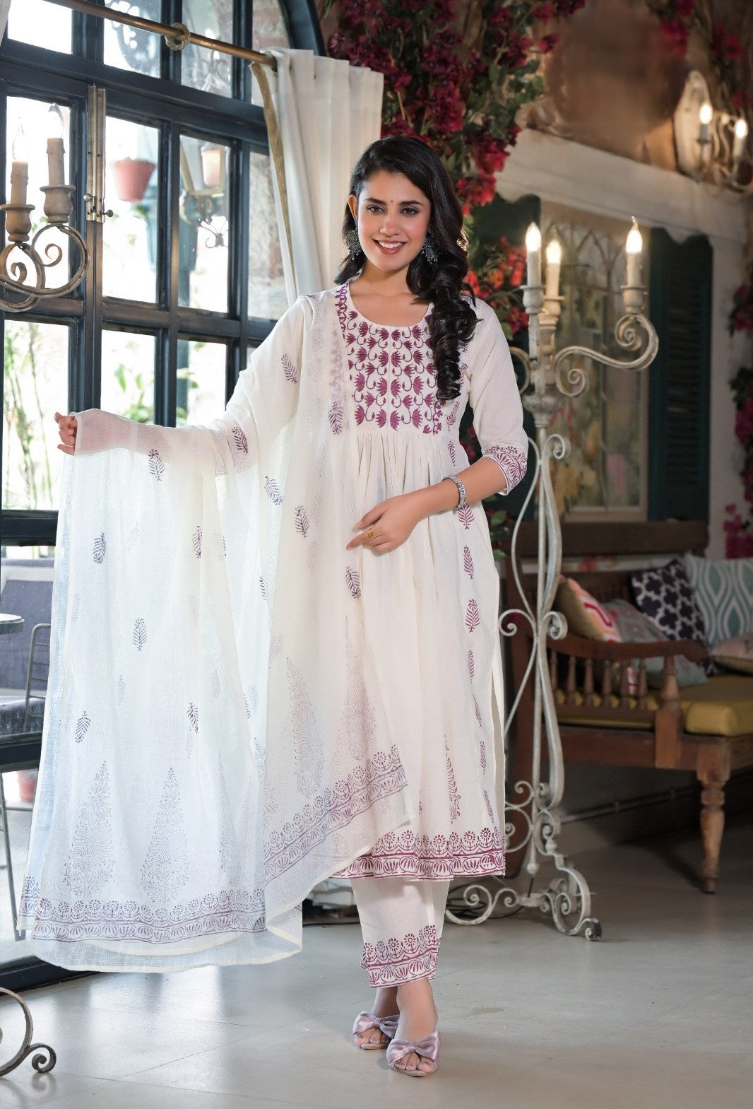 Elegant Pure Cotton Anarkali Dress Set with Dupatta & Pant White