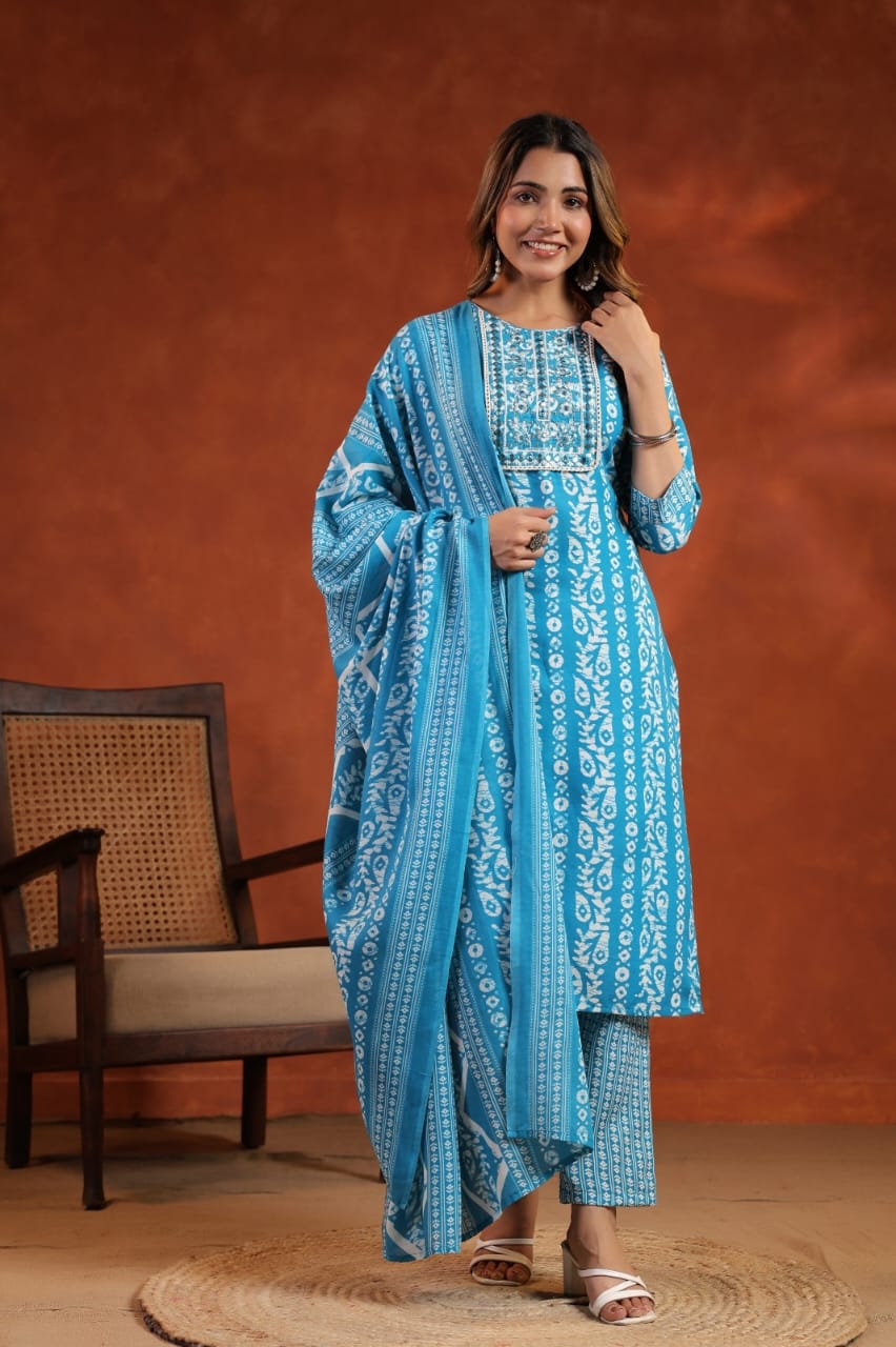 Elegant Pure Cotton Dress Set with Dupatta & Pant – Breathable & Stylish (Blue)