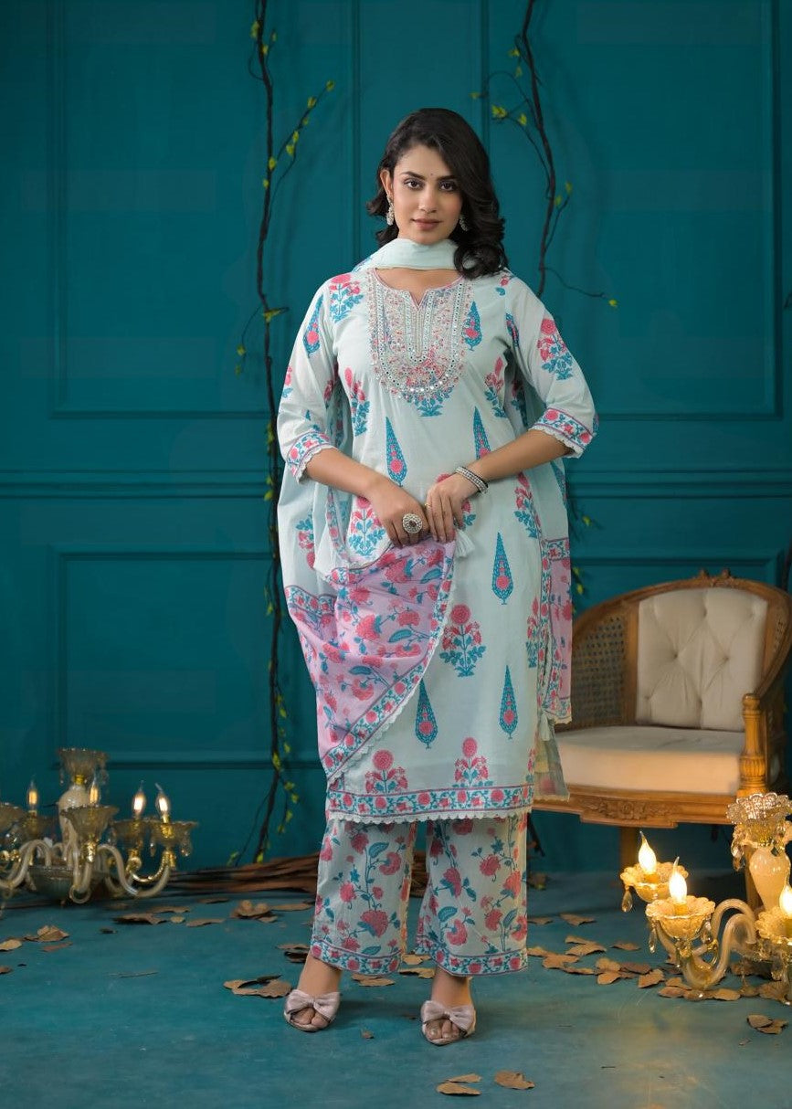 Elegant Pure Cotton Dress with Dupatta & Plazo – Breathable & Stylish Sky Blue