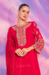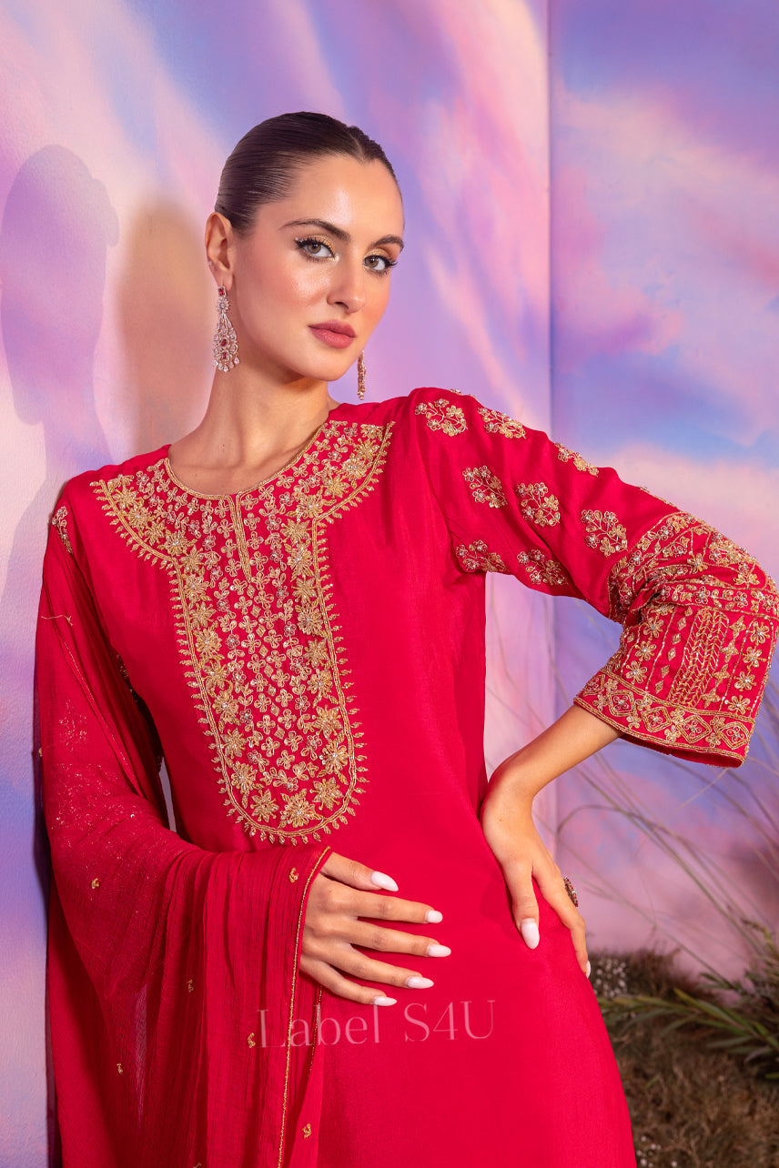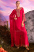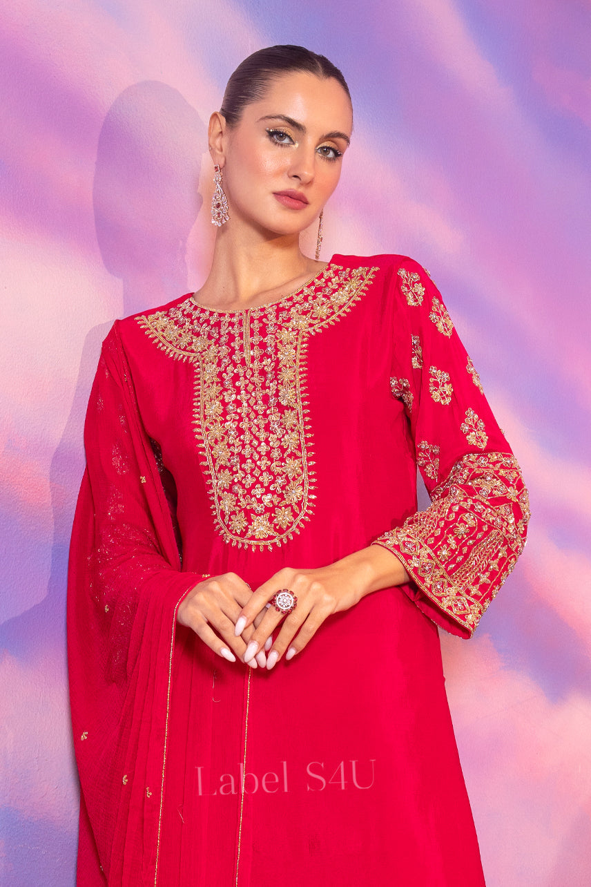 This exquisite three-piece sharara set is a perfect blend of tradition and modern elegance. Designed in a rich pinkish-red hue, this set features delicate handwork on the neckline, sleeves, and hem, making it a perfect pick for festive and wedding occasions.The kurta boasts intricate handwork, enhancing its regal appeal, while the flowy sharara pants with detailed embroidered borders add movement and grace. The sheer dupatta, adorned with matching embellishments, completes the look with finesse.Perfect for wedding celebrations, festive gatherings, or an elegant evening soirée, this outfit ensures you steal the spotlight effortlessly.